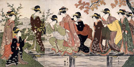 歌川豊国「丸木橋を渡る女たち」