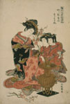 鈴木春次「庭を見る遊女と禿」