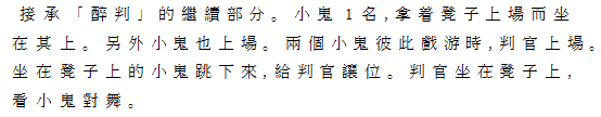 Ⅵ跳凳子 酔判の続き。小鬼1人が椅子をもって登場。これに座る。他の小鬼も登場、二人の小鬼が戯れているところへ、判官が登場。椅子に座った小鬼は、跳びおりて判官に席を譲る。判官は椅子に座り、小鬼の対舞を見る。