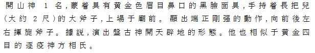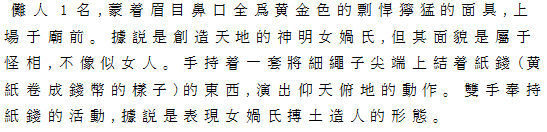 | Ⅱ紙銭 黒面に黄金の眉、目鼻、口を持つ剽悍、獰猛の仮面をつけた儺人一人、登場。古代神話の人類創造の神、女媧氏であるという。ただし、面貌怪異で、女性には見えない。長い紐の先に紙銭(黄紙を巻いて銭の形にしたもの)を手に持ち、天を仰ぎ、地を俯瞰する所作を演じる。紙銭を両手にとる所作は、黄土を博って人の形を作る動作を示すという。