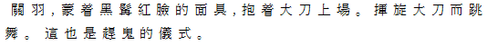 Ⅷ関公 紅面黒髯の関羽、大刀を抱えて登場。大刀をふるって跳舞する。これも鬼追い(趕鬼)の儀礼である。