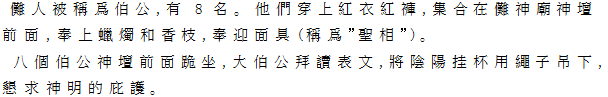 | (一)起聖 赤衣、赤袴を着用した8名の伯公と呼ばれる儺隊が、儺神廟内に集合、燭や香をともし、聖相(仮面)を迎える。8人は、神壇の前に跪座し、大伯父公は表文を読み、陰陽の卦杯を竹の先に紐で吊るし、神の加護を念ずる。