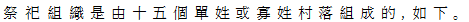 ここの祭祀組織は、十五の単姓または寡姓村落から成る。次の通りである。