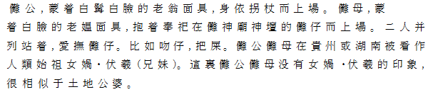 Ⅳ 儺公儺母 白面白髯の老翁、杖をもって登場。同じく白面の老媼、儺神廟に奉祀してあった子供の人形(儺仔)を抱いて登場。二人並んで、儺仔を愛撫する。吻仔、把尿など。儺公儺母は貴州、湖南では、人類の始祖、女媧、伏羲の兄妹と考えられているが、ここでの二人は、神秘的な面影はなく、土地公、土地婆のイメージが強い。