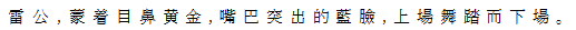 Ⅲ雷公 青い面に尖った口、黄金の目鼻の雷神仮面をつけた儺人一人、登場。舞踏して退場。