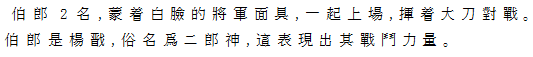 Ⅶ双伯郎 白面の将軍仮面をつけた伯郎二人、登場。太刀をふるって対戦する。二郎神(楊戩)の戦闘と勇力を示す。