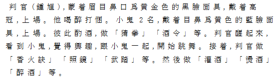 Ⅴ酔判(酔酒判官) 黒面に黄金の目鼻口眉をもった判官(鍾馗)、高い帽子をかぶって登場。判官は酒に酔う。そこへ青面に黄金の目鼻の小鬼2人が登場。酒を酌み交わし、猜拳、酒令に興ずる。判官は目を覚まし、小鬼2人を見て興を発し、三人で舞う。判官は「香火訣」「照鏡」「武踏」などの所作を演じ、「灌酒」「燗酒」「酔酒」の姿を見せる。