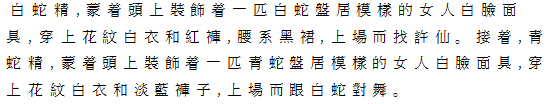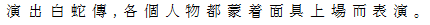 2 頭に盤居した白蛇を戴いた女性仮面をつけ、白地花紋の上着、紅色褲子をはき、腰に