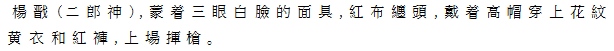 | Ⅱ楊戩(二郎神) 紅布纏頭、高い冠帽をかぶり、眉間に1目を配して三目の白面仮面をかぶり、紅色の褲子に黄地花紋の上着をつけた楊戩(二郎神)が登場、槍を振り回す。