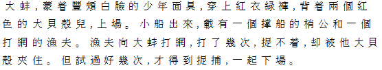 Ⅷ打蚌殻 白皙豊頬の仮面に白地花紋、緑色褲子をつけ、背に二枚の紅色の大貝殻を背負った蚌が登場。船をこぐ梢公と網をもった漁夫が登場、漁夫は、蚌に向かってたびたび網をなげるが、捕獲に成功せず、かえって大貝殻に手をはさまれる。三度目の網打ちでようやく捕獲に成功し、退場。