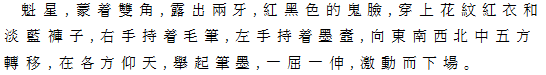 | Ⅴ魁星 双角、両牙、褐色鬼面をかぶり、水色の褲子に紅地花紋の上着をつけた魁星が登場。 右手に筆、左手に印をもち、東西南北中の五方を移動し、身をそらし、両手をあげて筆 と墨を示しつつ、屈伸舞踏をおこなう。