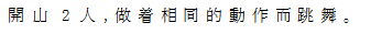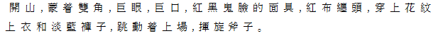| Ⅰ開山 紅布纏頭、双角、巨眼、巨口の鬼面をかぶり、水色の褲子に紅地花紋の上衣を着た開 山が、跳びはねながら、斧を振り回す。