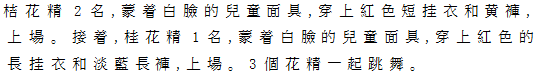 ⅩⅣ桔桂 童顔仮面に、紅色の短掛衣、黄色の短褲をつけた桔花の精二人と、童顔仮面に、紅色 の長掛衣、水色の長褲をつけた桂花の精一人、計三人の花の精が跳舞する。