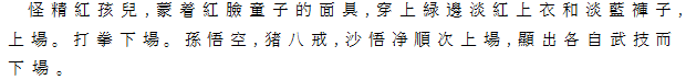 2 童顔仮面に桃色地に緑色で縁取りした上着、水色褲子をつけた怪物、紅孩児が登場。拳術を示して退場。そのと、孫悟空、猪八戒、沙悟浄、順次、1人ずつ出て、武技を示す。退場。