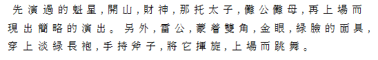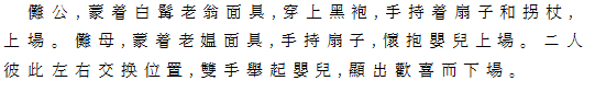 Ⅹ儺公儺母 白髯の老翁仮面に、黒袍を着た儺公、扇と杖を持って登場、ついで老媼仮面に、白地 花斑の上着、紅褲をつけた儺母、扇と嬰児を抱えて登場。二人は交互に位置を換え、嬰児を差し上げ、歓喜の態を示して退場。