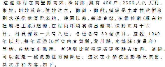 | この村は、南豊県の南郊、橋背郷にあり、戸数450、人口2556人の大規模村落である。朱姓、胡姓が多数を占め、陳姓これに次ぐ。儺舞・儺戯は本村の武術師、劉求孫が武漢から持ちこんだものという。戦前は、春節に元来、儺神廟であった「福主殿」で「起儺」を行い、正月十六日まで、村内の坪場にて演じたという。儺舞隊は、全村を通じて8班あり、各班30数個の演目を持つ。1949年以前は、毎年、江西省内の宜黄県、黎川県、南城権(広昌県)などを巡歴して各地の儺礼に出演したという。時には、隣省の福建省建寧県にまで、足を伸ばしたこともあるという。広域遍歴の芸能団としての実態を有する。 |