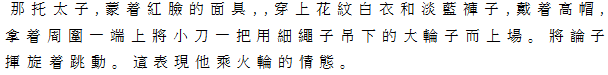 | Ⅲ那托太子 紅顔白面の仮面に黒帽をかぶり、水色の褲子と白地花紋の上着をつけた那托太子、刀を紐で垂らした輪をもって登場。輪を振り回しながら、跳ね回る。火輪に乗る幼童の地那托太子の姿を示す。