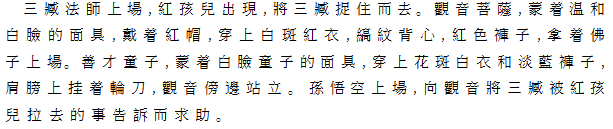 3三蔵出る。紅孩児が現れ、三蔵をさらって去る。紅帽、白色温顔の仮面をつけ、紅地白斑の上着、縞模様の背心、紅褲をつけた観音菩薩が登場。孫悟空登場して、紅孩児による三蔵の拉致を訴える。童顔仮面に白地花斑、水色褲子をつけた善財童子が輪刀を肩にかけて、観音の横に侍立する。