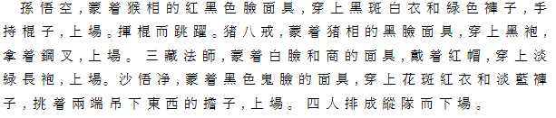 1 紅色猿相の仮面、白地黒斑の上着に緑色褲子をつけた孫悟空が登場。棒をふるって跳躍。ついで黒色猪相の仮面、黒袍を着た、釵を持って登場。続いて、紅帽白面、薄緑色の長袍を着た三蔵法師が登場。さらにそのあとに、黒色仮面に紅地花斑の上着、水色褲子の沙悟浄、両端に荷を吊るした天秤をかついで登場。やがて四人、縦隊で退場。