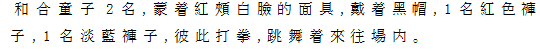 | Ⅳ和合 紅布纏頭、黒帽に紅頬白面の和合童子二人、一人は紅褲、一人は水色褲子で登場。素手の対拳を繰り返しながら、場内を跳舞する。