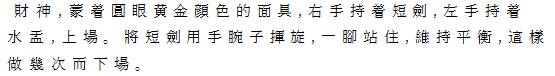 | Ⅵ財神 高帽、円眼、金色仮面をつけた財神、右手に短剣、左手に水盃をもって登場。右手の 短剣を手首だけで振りまわし、片足をあげてバランスをとる。これを繰り返す。